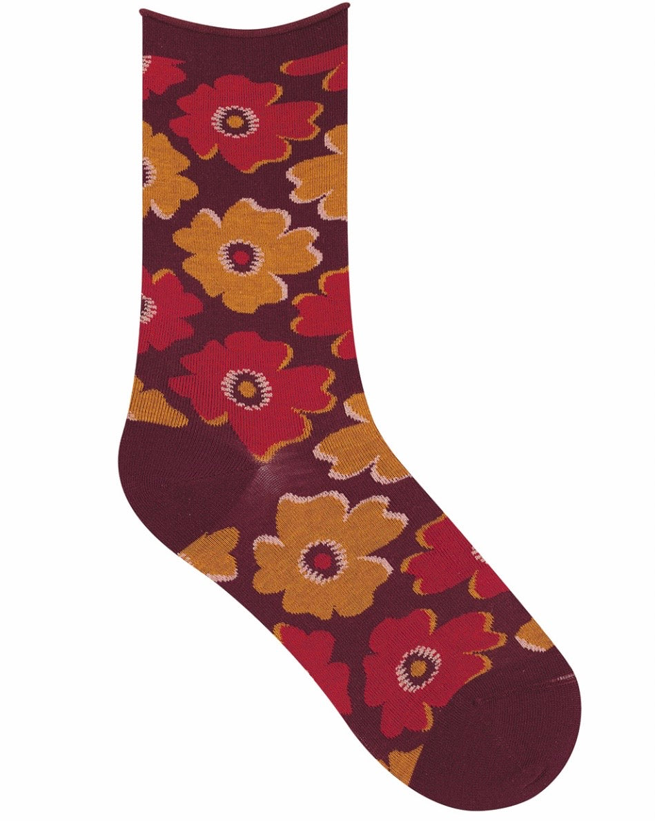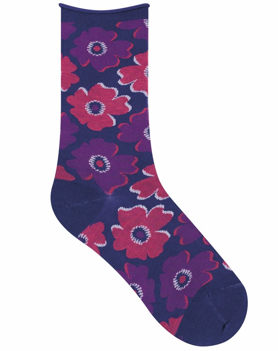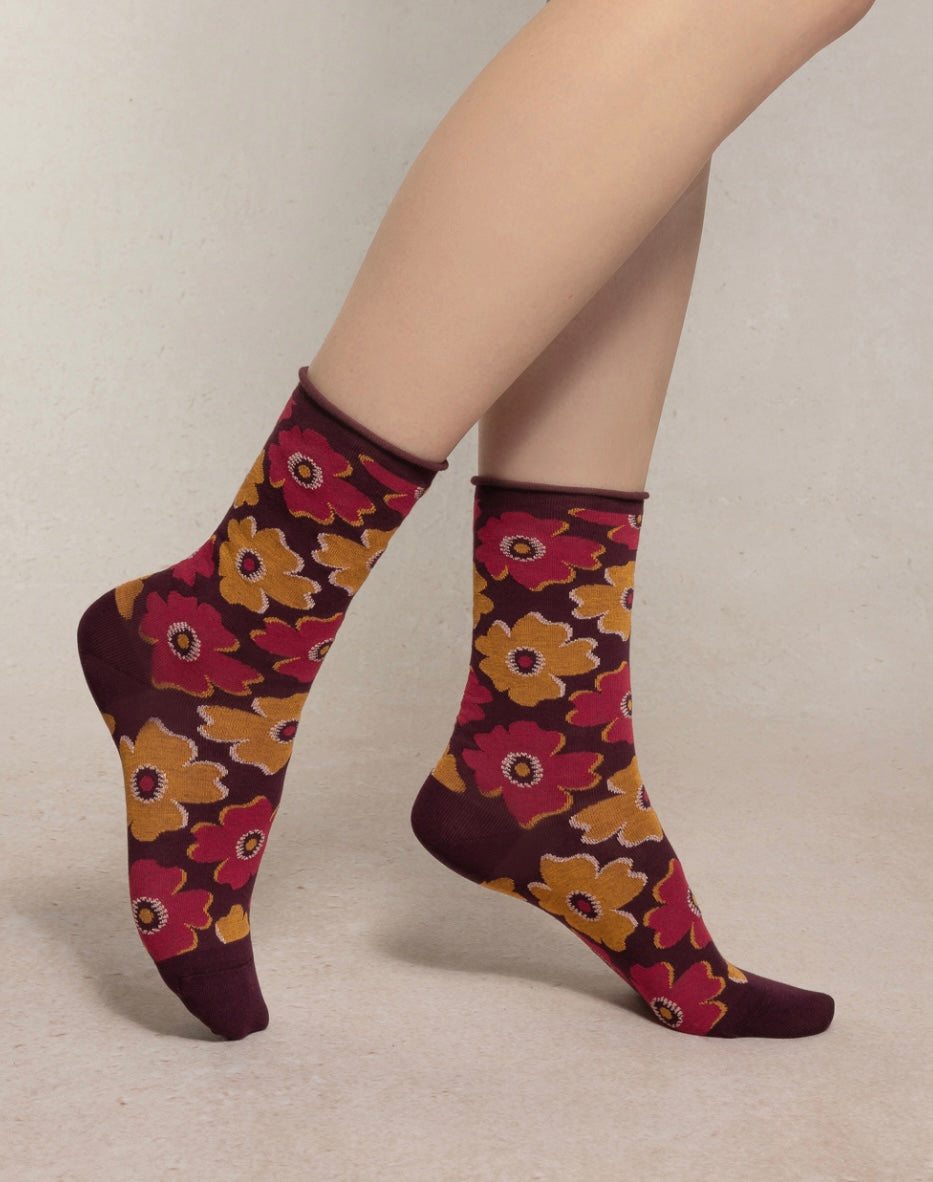 Combed Cotton ladies sock, with petunias pattern . 90% cotton , shoe size 7.5-10. Made in France. Available In 3 colors.