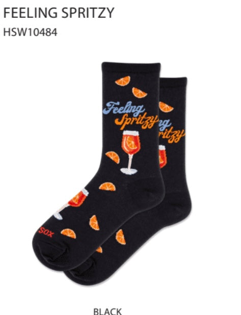 Colourful sock with a spritzer glasses on in orange, on a black background. Made by Hot Sox. One size fits ladies shoe size.