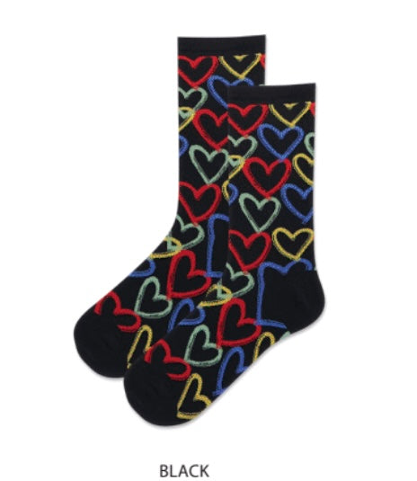 Multi coloured heart design , graffiti style, on a black sock. One size fits ladies shoe size.