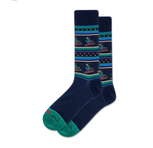 Navy sock with a downhill skier design . One size fits men’s shoe size.